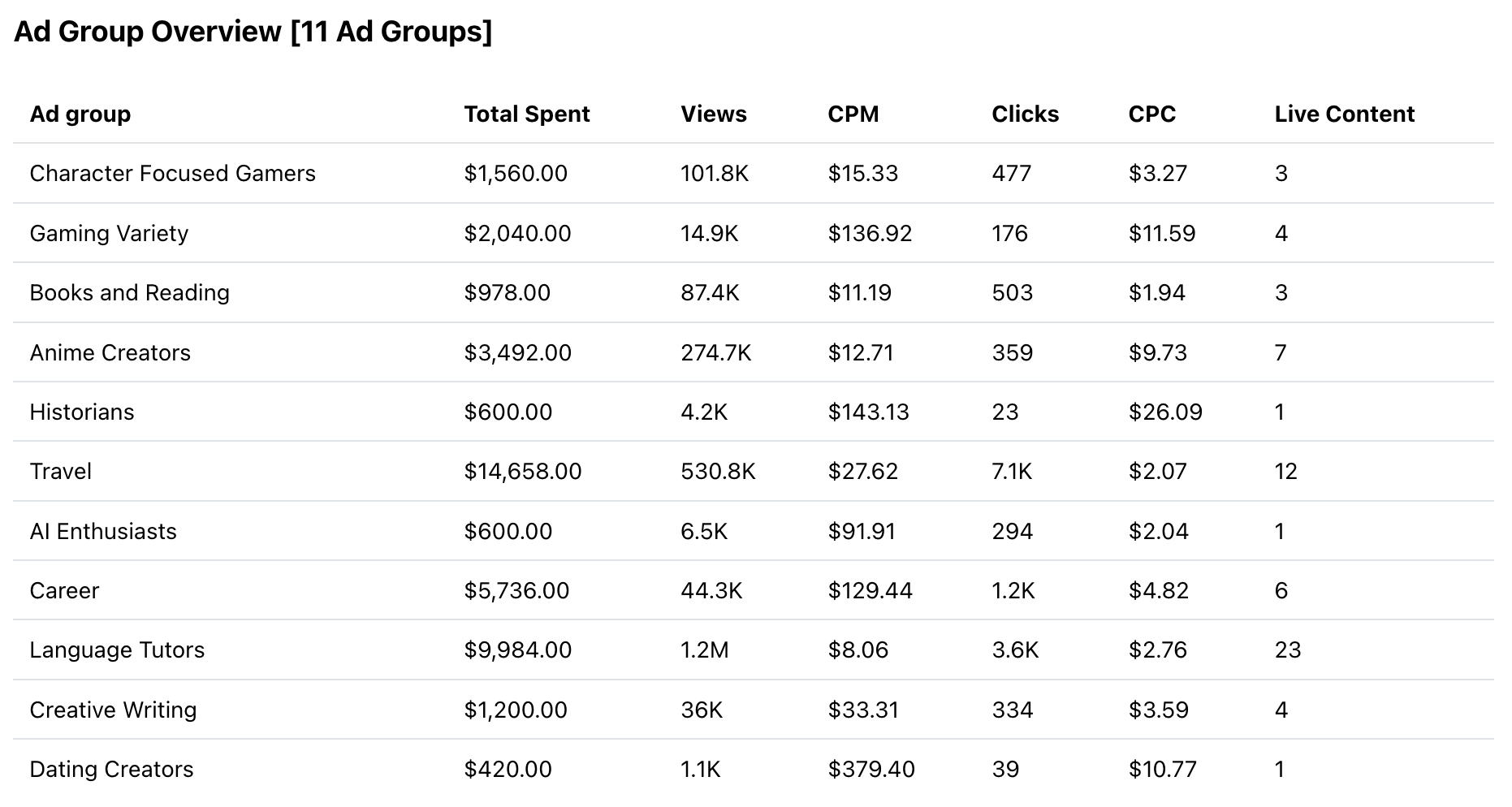 As creators are going live, they will report out on real time engagement and link click metrics. They will cut things by ad groups as well so you can experiment with different briefs and creator populations to understand what works well.