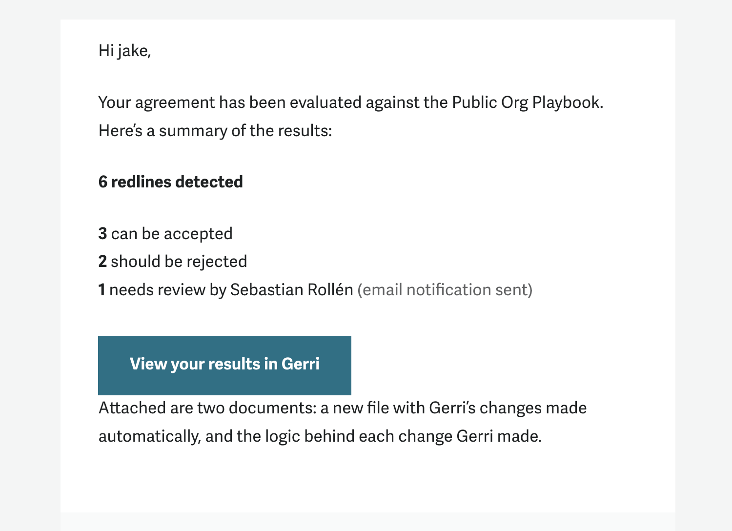 - Have Gerri scan your team’s inboxes for redlined contracts and automatically review them as they come in.