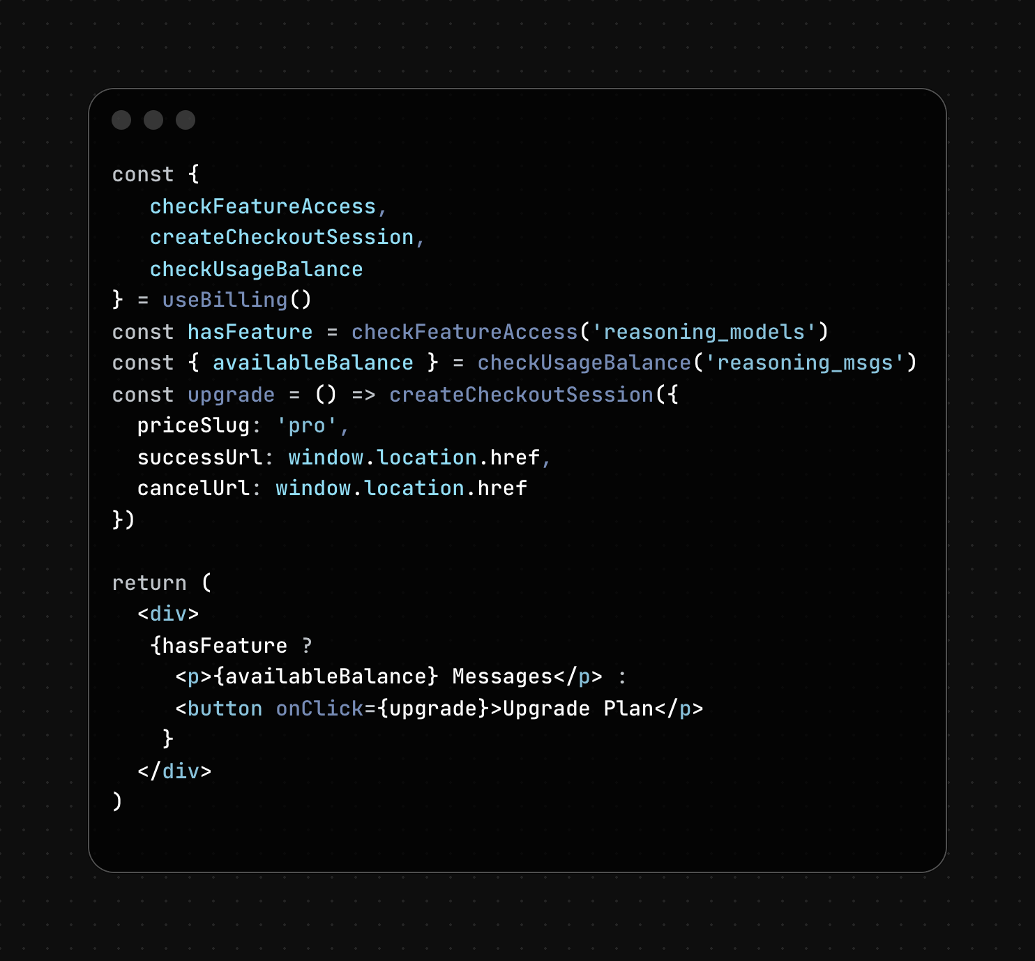 Like other payment providers, Flowglad handles the money movement for you. But unlike others, they also give you a source of truth for what your customers get access based on their billing state. You can check your customers’ access and create checkout sessions like so: