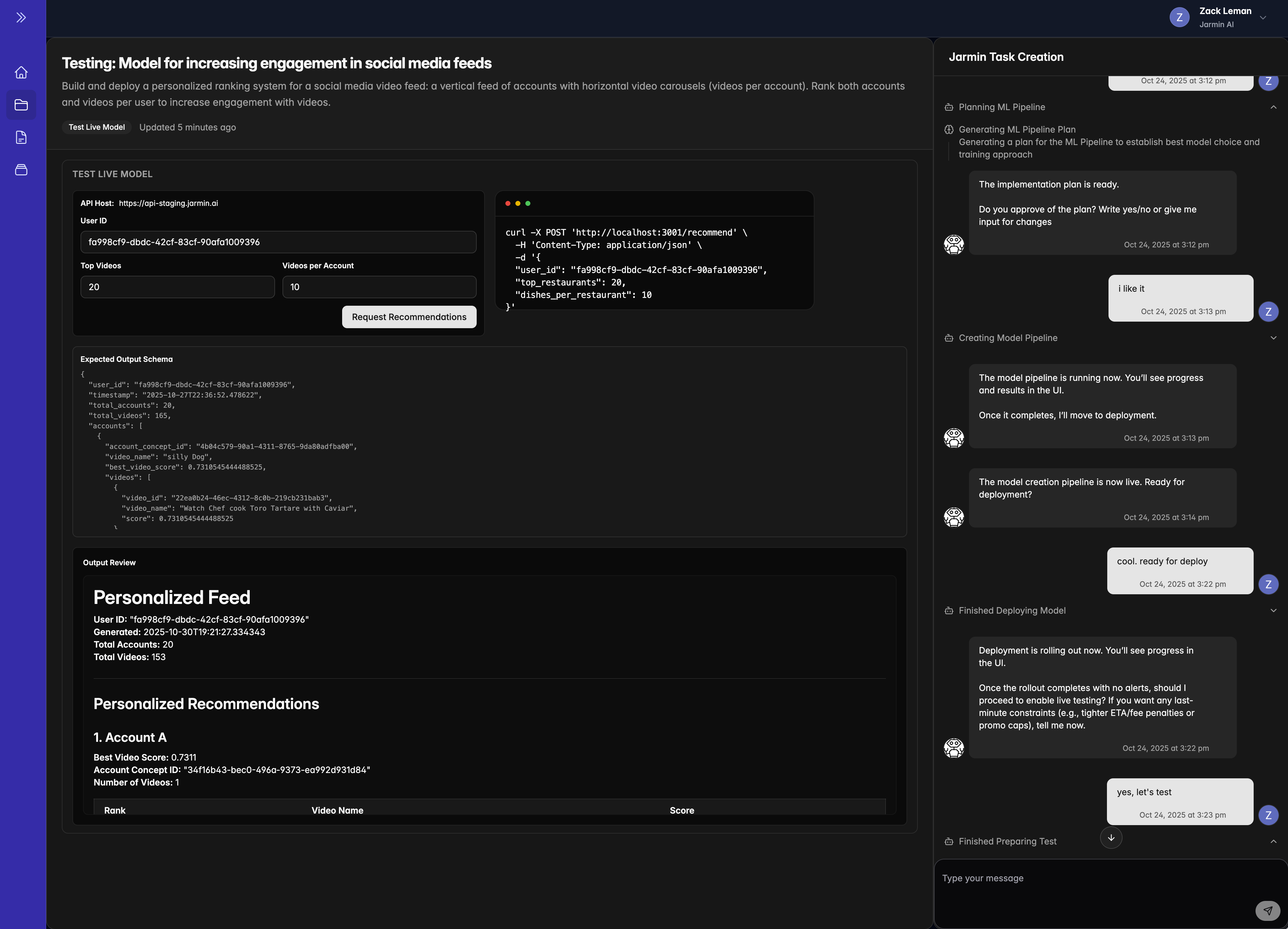 TL;DR: Jarmin is an autonomous ML engineer that ships production AI/ML features. Assign projects or individual tasks, and Jarmin handles the end-to-end workflow for models, pipelines, testing, and improvements.