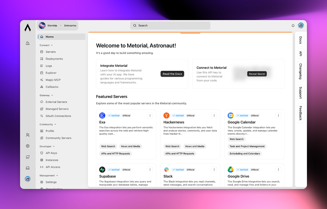 They handle all of the complicated parts of MCP so their customers get to enjoy the good parts. Enterprises love Metorial because they solve security, scalability, and access control for MCP. Developers and startups love Metorial because they can deploy MCP servers on Metorial's platform in just 3 clicks -- they even handle OAuth. Metorial's SDKs let them connect their agents to MCP servers on Metorial in a single function call. Their serverless runtime is the only one that solves security for multi-tenancy, supports sub-second cold start, and does stateful hibernation for long-running connections.