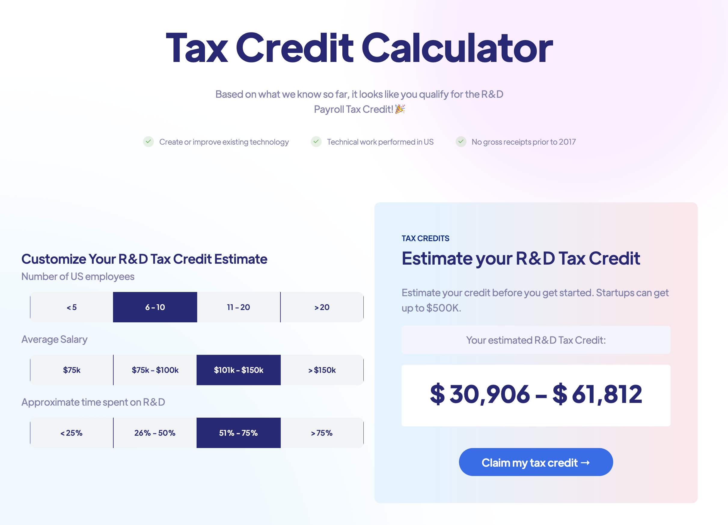 The amount of money you can get back is based on your company's R&D expenses (founder/employee/contractor payroll) and can be up to $500k per year. See how much you can get back with our Tax Credit Calculator →