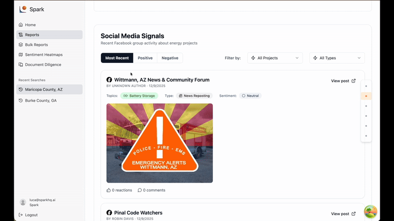 Spark tracks social media activity across every U.S. county for solar, storage, and data center projects. Users identify relevant groups, engagement patterns, and sentiment before the first meeting hits the calendar.