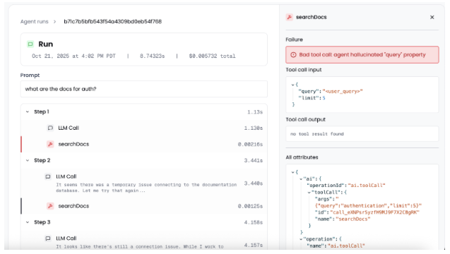 - Dashboards: Full visibility into agent runs, tool calls, latency, costs, and semantic failures.