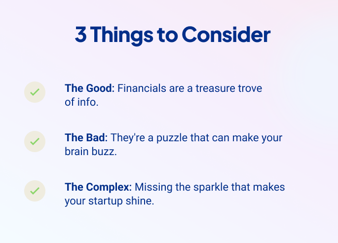 Here's the kicker: financial statements are packed with info, but they can be a tough nut to crack. They're full of complex terms that might make your head spin. Plus, they don't always capture the magic of what makes your startup sparkle—the unique flair of your brand or the innovative edge of your latest product that sets you apart.