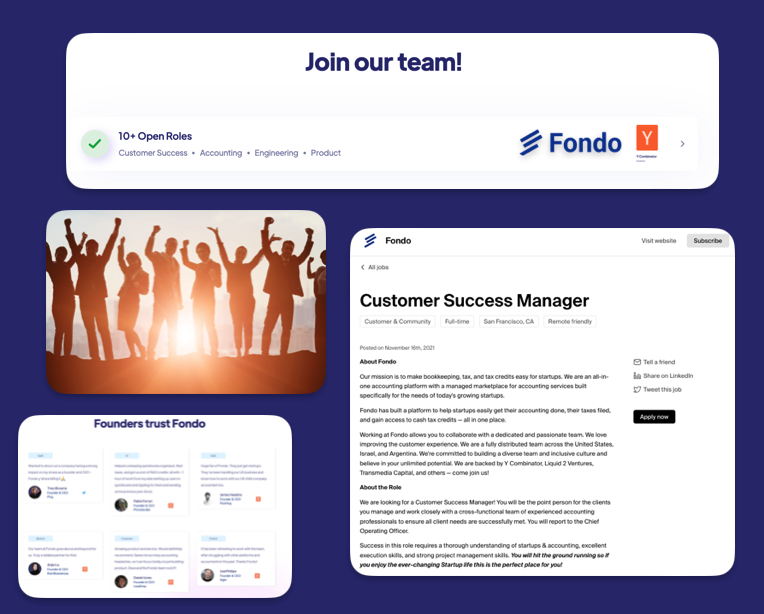Working at Fondo is an incredibly rewarding experience. Fondo CSMs will be part of a dynamic and talented team of professionals who are passionate about helping startups achieve their goals. We're dedicated to providing an exceptional experience for our clients and each other. We value collaboration, creativity, hard work, and a can-do attitude.