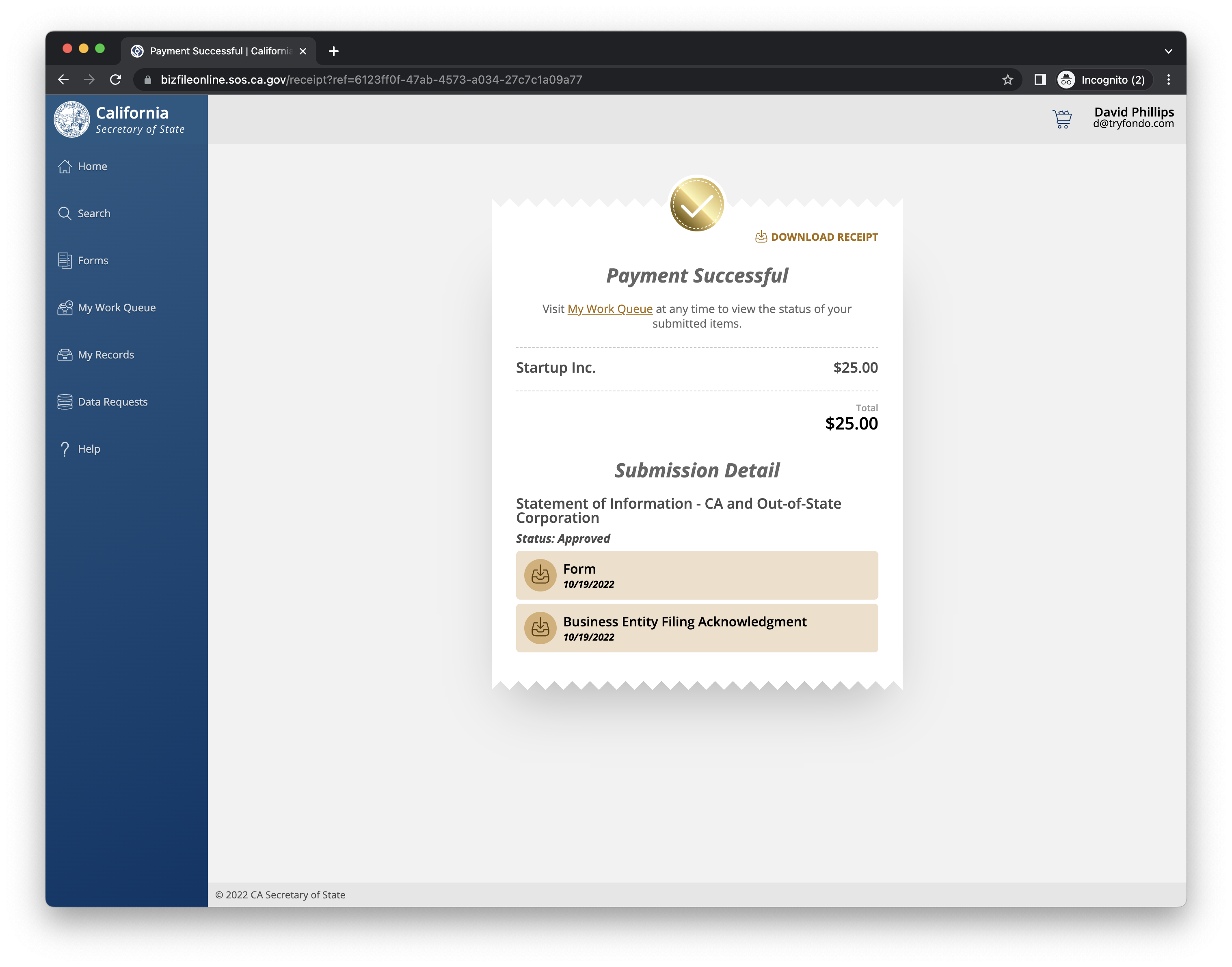 Your registered agent should handle this filing for your company. Startups who are headquartered in California, typically have their founder as the registered agent. Startups who are outside of California, but have an employee in California, for example, will use a registered agent service to register the company to do business in California (we recommend Middesk for this).