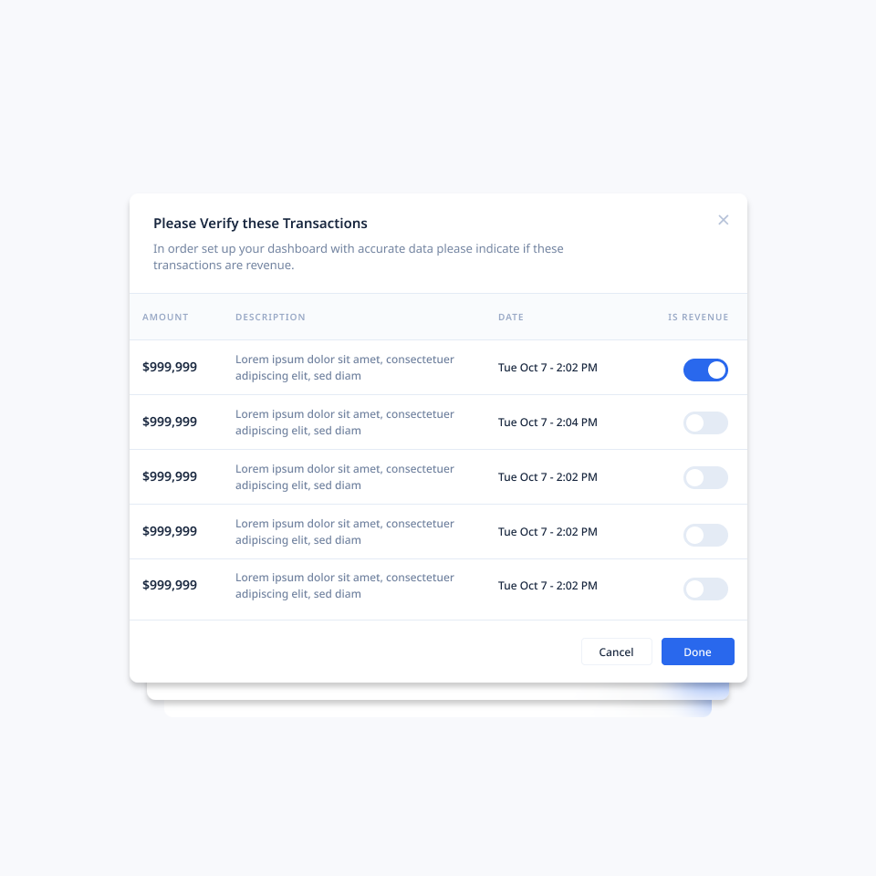 Verify some financial transactions — just a few so we can populate your dashboard.