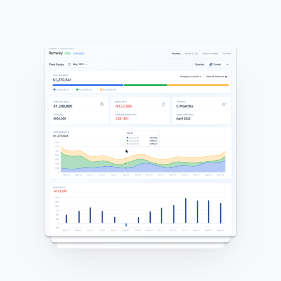 Explore your key metrics — including Runway, Profit & Loss, Balance Sheet, & a custom Tax Plan for your startup.