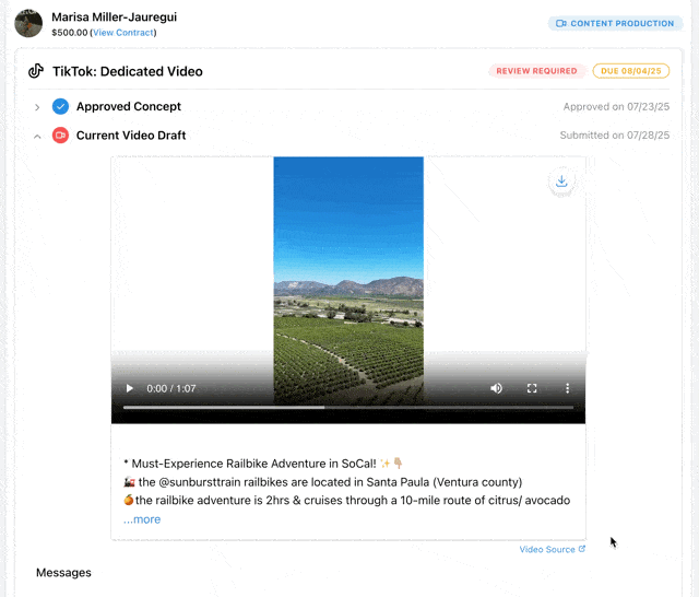 Creators submit concepts and draft videos for your approval. All revisions stay organized in one place. Once you give the green light, they take care of payouts and collect performance data.