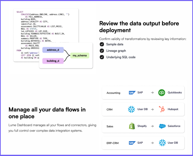 The no-code platform helps engineers build and maintain custom data integrations with AI. Whether you want to map multiple sources to your internal unified schema or connect to your third-party apps without manual mapping, Lume delivers.