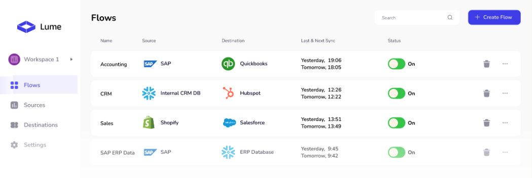 Lume uses AI to automatically transform data between any start and end schema, and pipes the data directly to your desired destination.