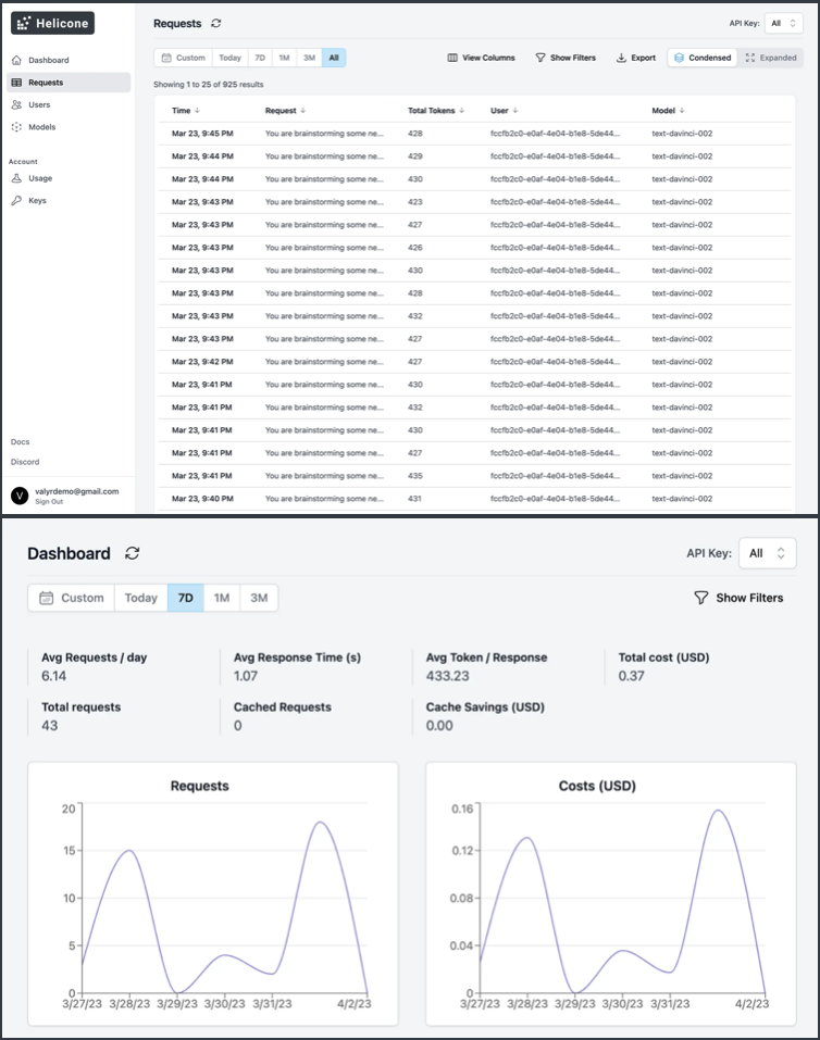 Helicone logs your completions and tracks the metadata of your requests. It is an analytics interface for understanding your metrics broken down by users, models, and prompts with visual cards. It caches your completions to save on bills, and helps you overcome rate limits with intelligent retry techniques. Track costs, usage, and latency for GPT applications with one line of code.