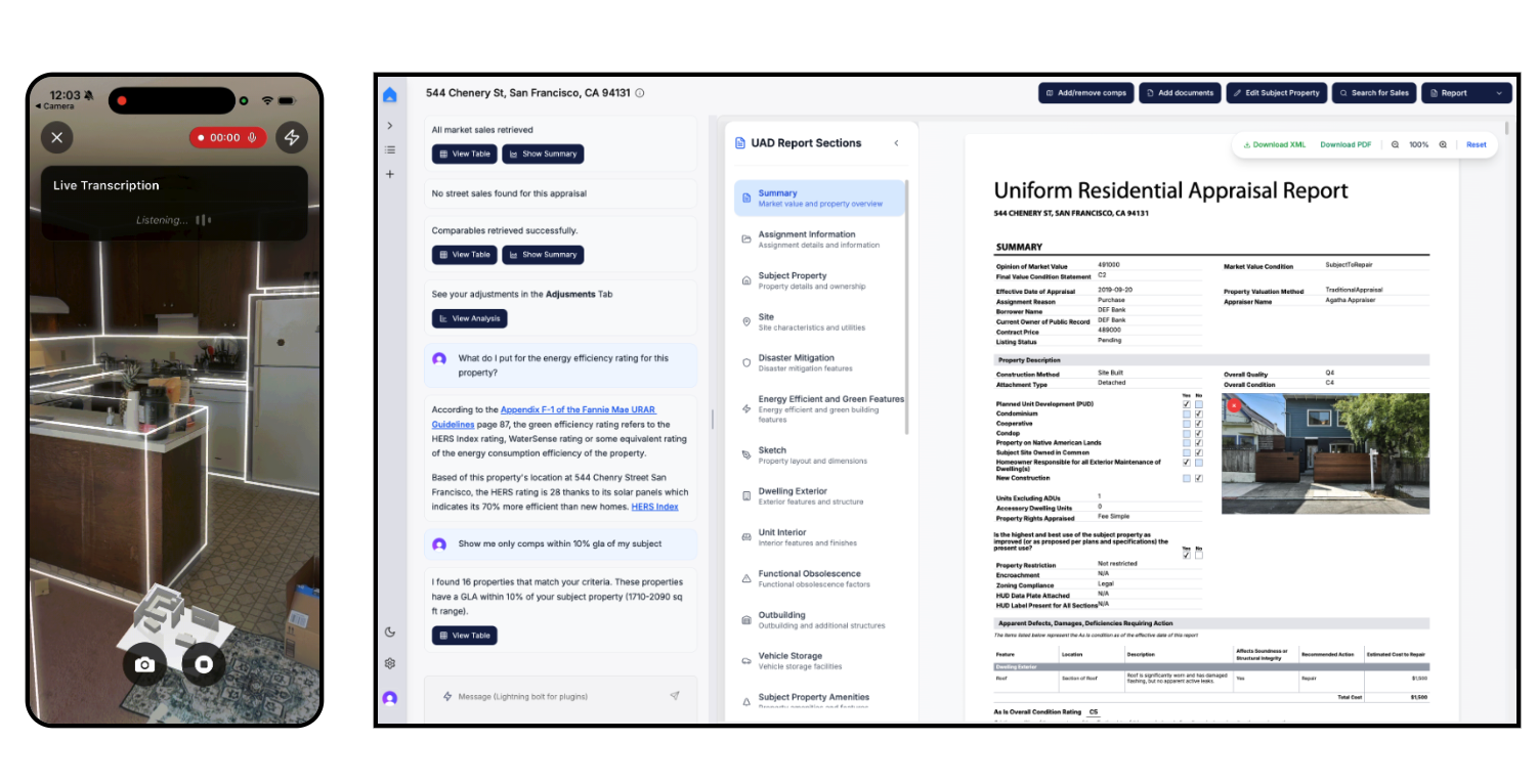 That data feeds into AI Agents trained to follow the appraisal process, which generate a full valuation in under 10 minutes by reconciling market data, selecting and scoring comps, cleaning faulty inputs, and adjusting for subtle market signals (like how an upward-sloping backyard might impact site value uniquely in your neighborhood). A licensed staff appraiser then reviews, edits, and signs the report using Appraisal Copilot- their suite of AI tools for order management and review- interrogating data, tracing comps, and re-running analyses in context.