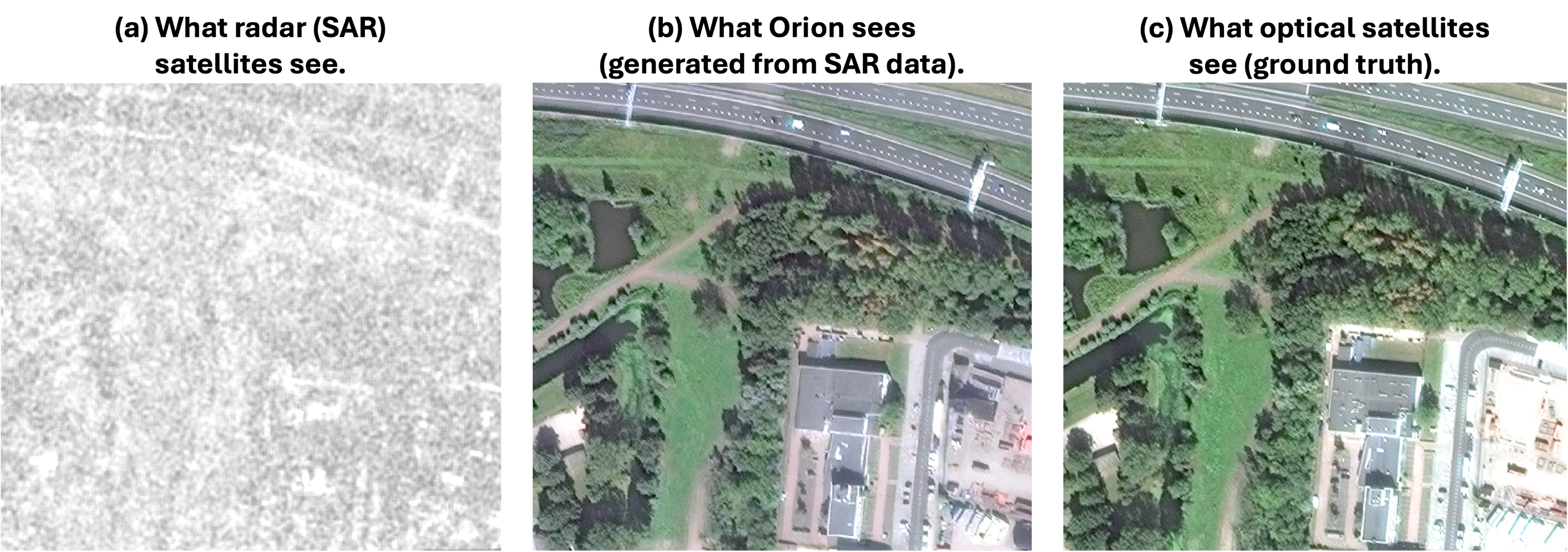 ORION is the most advanced Earth Observation model ever created, making continuous visibility possible. It has a FID score of 30.24, beating the current SOTA C-DiffSET by 19.23% on the MSAW benchmark. It also crushed every competitor with a SSIM score of 0.60.