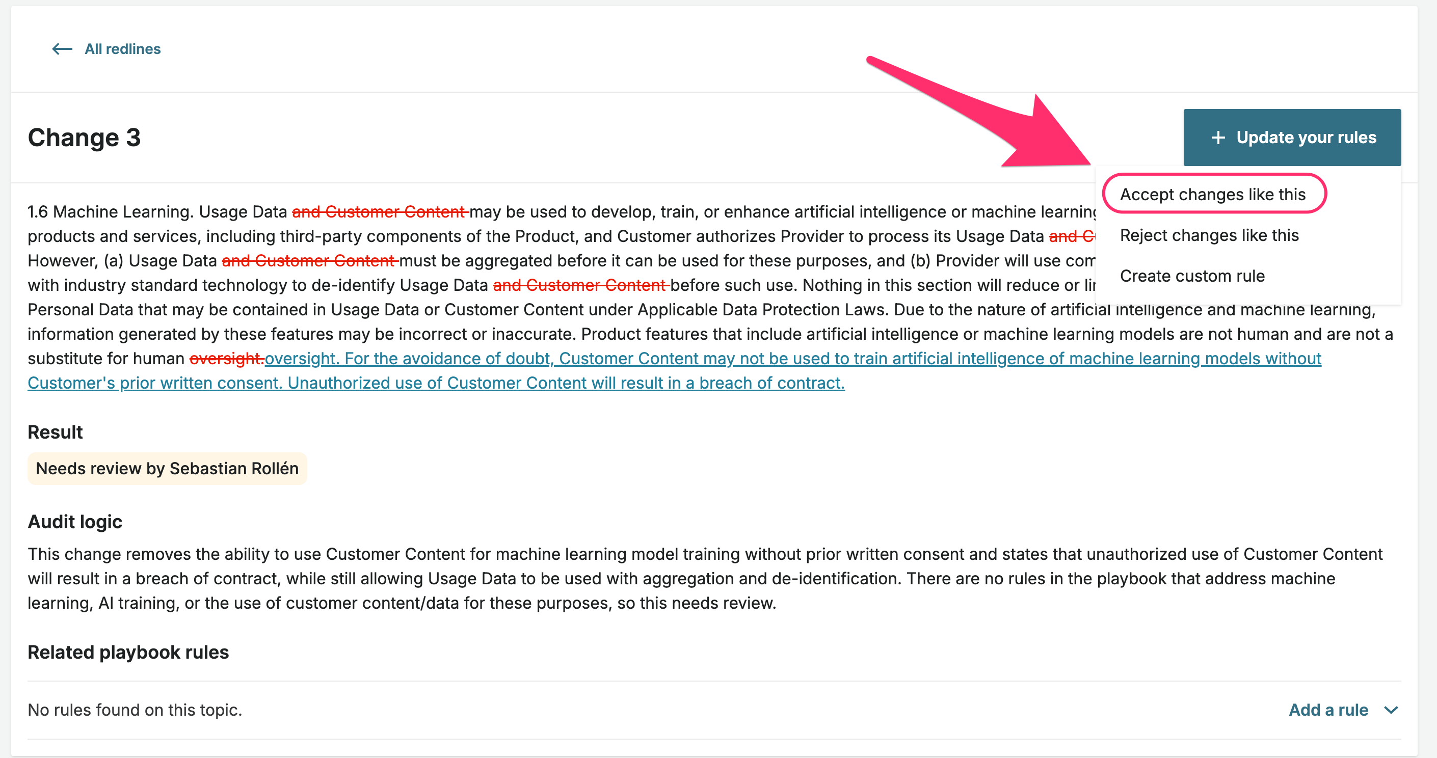 - Flags which redlines can’t be handled automatically, and notifies the right people for them to weigh in. For example, it might be your lawyer for indemnity issues, CS lead for renewal terms, and IT for special security procedures/certifications.