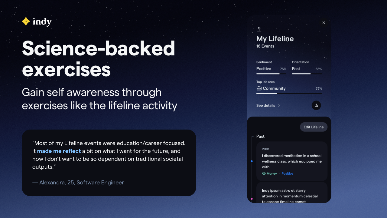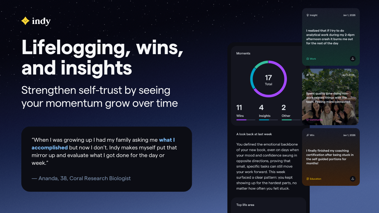 - Daily and weekly check-ins: Indy helps users set lightweight intentions, anticipate obstacles, and reflect without pressure.