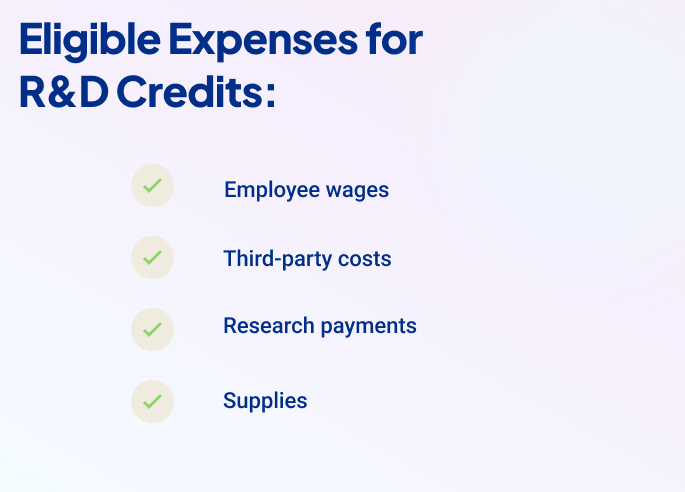 In order to claim R&D credits, businesses can include certain expenses related to research and development activities. These expenses can be classified into different categories, including employee wages, third-party costs, research payments, and supplies. When calculating R&D credits, it is important to consider these eligible expenses for maximum tax benefits.