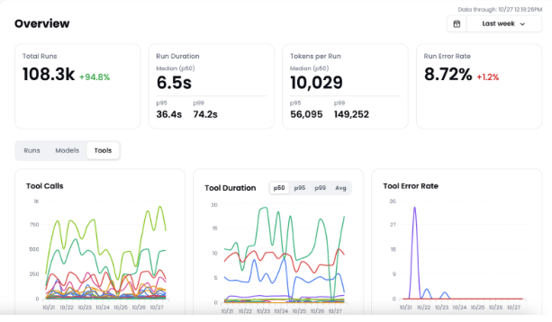 - Dashboards: Full visibility into agent runs, tool calls, latency, costs, and semantic failures.