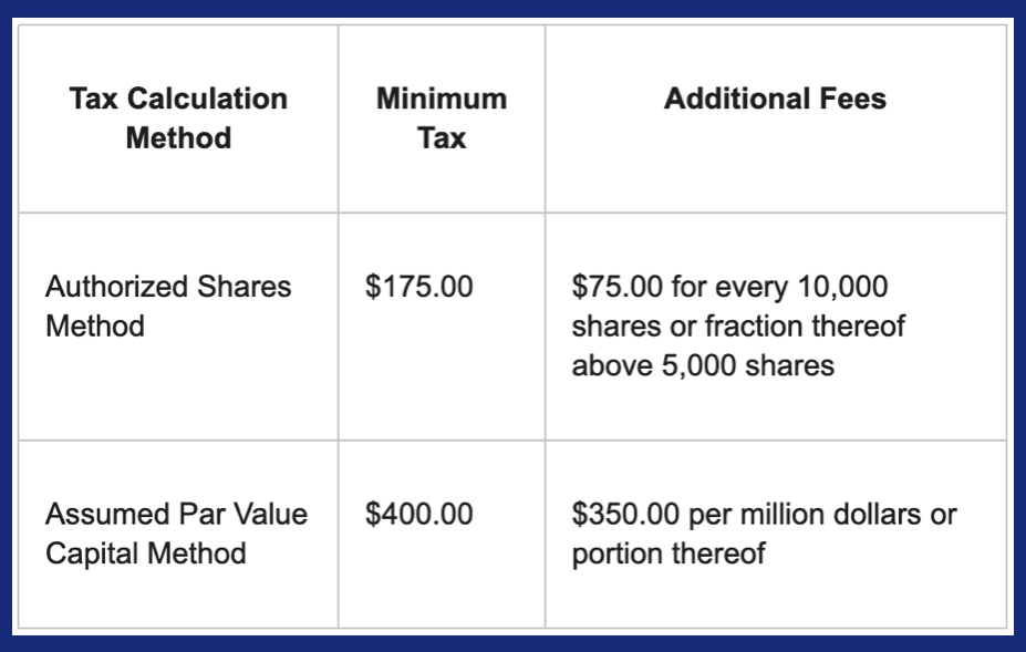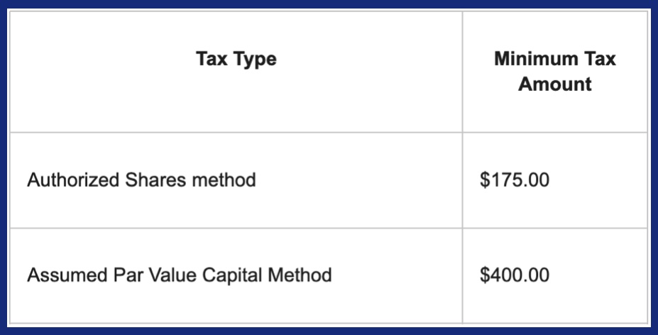 - The minimum Franchise Tax is $175.00 for corporations using the Authorized Shares method and $400.00 for corporations using the Assumed Par Value Capital Method.