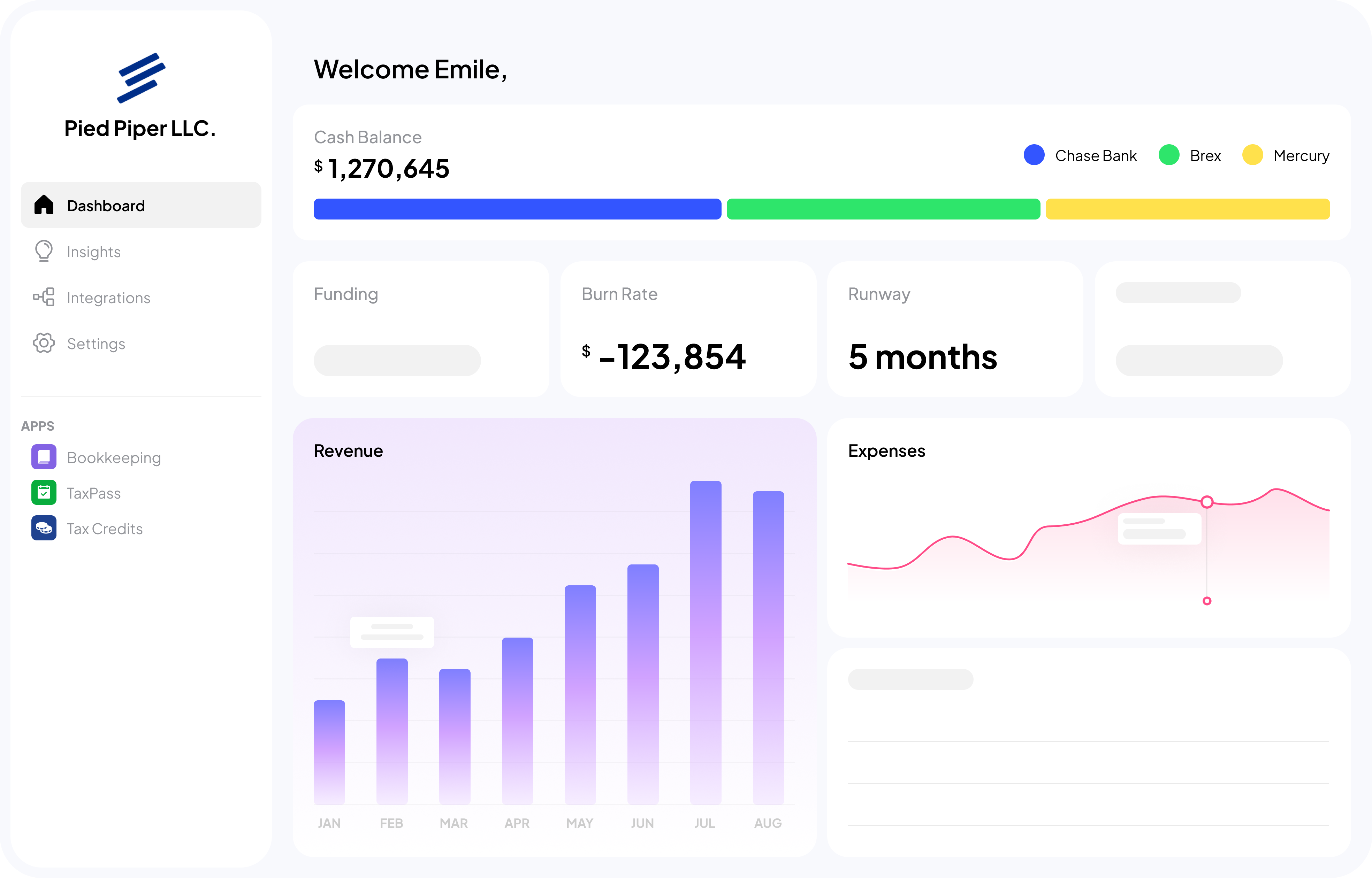 Explore your key metrics — including Runway, Profit & Loss, Balance Sheet, & a custom Tax Plan for your startup.